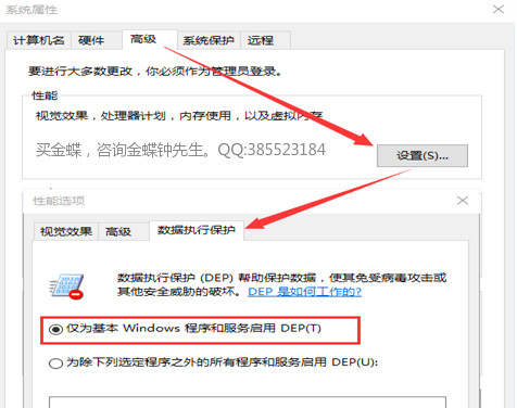 1 請確保電腦的數(shù)據執(zhí)行保護為關閉狀態(tài): win鍵+R鍵調出“運行”對話框,輸入sysdm.cpl→確定→高級→第一個設置按鈕→數(shù)據執(zhí)行保護,選中“僅為基本windows程序和服務啟用DEP”確定,重啟電腦